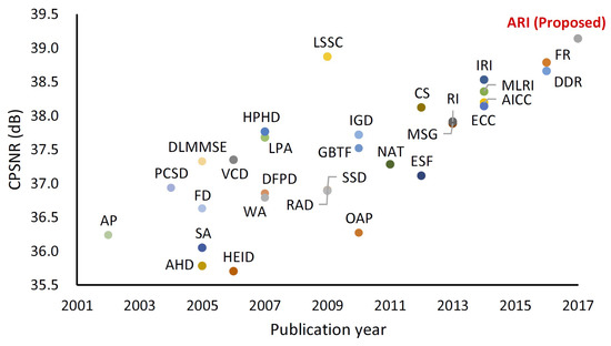 A good overview of the performance of the classical demosaicing algorithms (that are not deep-learning-based) is given in the graph from [14], shown in Figure 1. As it can be seen, ARI [14] outperforms all previous algorithms. Its good performance is due to the fact that it is an iterative approach based on the assumption of color consistency along the edges and smooth areas. Additionally, the algorithm considers the color differences in creating the final demosaiced image. However, this method, despite its good performance in the way it was designed, is not generic and is applicable only to Bayer pattern CFA and the multispectral filter array (MSFA) that was presented earlier in [10]. Classical demosaicing techniques have an advantage of being applicable to any type of image without requiring training data, while, on the other hand, the modern learning-based algorithms show superior performance and can be modified to be applied on different CFA patterns, which makes them generic.