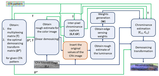 The flowchart of the modified ACUDe is presented in Figure 2. The input data that is considered is: the CFA pattern and the CFA filtered image (CFA input). The green arrows represent the CFA pattern dependent data-flow, and the blue arrows represent the CFA filtered image dependent data-flow. For more details about the algorithm and each procedure, we refer to the explanation given in [28]. The modifications that were made consist of inserting the original values of the CFA filtered image to the corresponding locations in the output image. This procedure is applied after obtaining the rough estimate of the demosaiced image (non-adaptive demosaicing). For the main source-code used in our implementation and the obtained results for Bayer pattern, of the originally designed (as explained in [28]), and unmodified ACUDe, we direct the reader to the following web-site [41].