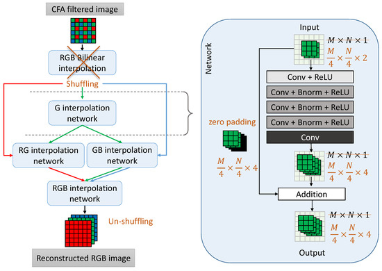 For this study, we need to compare the performance of the same demosaicing algorithm using different CFA patterns. To make the CDMNet algorithm agnostic of the pattern, we made several modifications of the original version of CDMNet, shown in Figure 3 and explained in more details below: