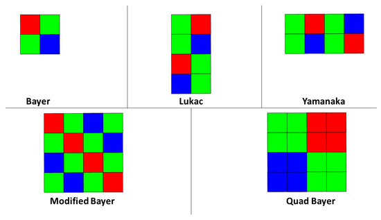 Bayer-like CFA patterns used in the experimental analysis: Bayer, Lukac, Yamanaka, Modified Bayer and Quad Bayer.