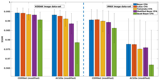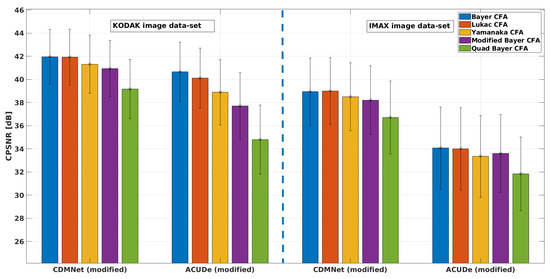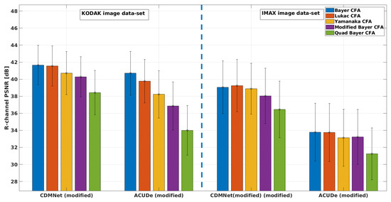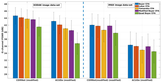 In Figure 5, we present the averaged CPSNR results with the standard deviation of the mean (over the images from each image data-set) obtained for each analysed Bayer-like CFA pattern, with the representative techniques (the modified ACUDe and the modified CDMNet). In Figure 6, Figure 7 and Figure 8, we present the average PSNR results with the standard deviation of the mean (over the images from each image data-set) for each channel separately. In the same way, in Figure 9, we present the SSIM results.