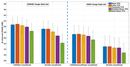 Average PSNR (blue channel) results with standard deviation of the mean: for the two modified generic algorithms (“CDMNet modified” and “ACUDe modified”), for the two data-sets (“KODAK” and “IMAX”), for five different Bayer-like patterns (Bayer, Lukac, Yamanaka, Modified Bayer and Quad Bayer).