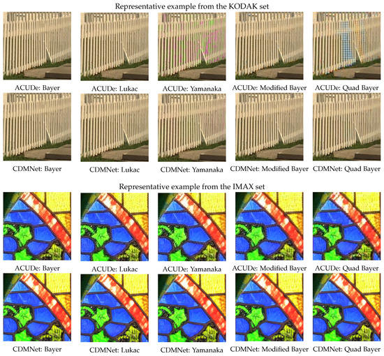Following the common practice for quality performance evaluation, in the performed analysis for the two modified state-of-the-art generic algorithms, we used the two well-known image data-sets: KODAK [39] (abounding with highly diverse in content and with plenty of details images) consisted of 24 images in total (18 images with resolution of pixels and six images with a resolution of pixels) and IMAX [40] (abounding with highly diverse in content and colors and with plenty of details images) consisted of 18 images with resolution of pixels. The second image data-set, IMAX, is more challenging for quality performance evaluation of the demosaicing algorithms. These image data-sets do not coincide with WED and are therefore new, previously unseen data for the modified CDMNet. For testing the quality performance of the modified CDMNet, each of the five trained neural network models (one model for every CFA design presented on Figure 4), was applied on the input mosaic images obtained with the appropriate CFA pattern.