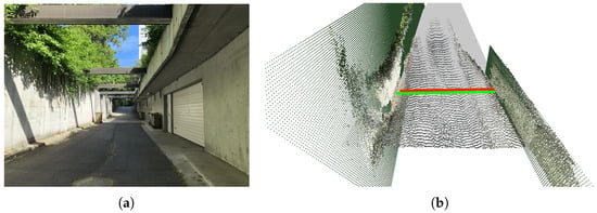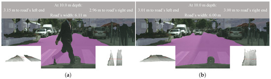 As a qualitative example, in Figure 12, we applied our proposed system with a focal length of 580 on the frame Munich-3. We display the frame’s segmentation together with the information about the computed distances on Figure 12b and the post-processed 3D point clouds with the predicted road’s width and the fence-to-fence distance (red and green lines, respectively) in Figure 12c,d.