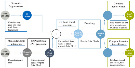 We present a novel vision-based method (Figure 4) to locate a vehicle within the road when no lane lines are present, thus naturally complementing traditional LDWSs which only rely on the existence of road markings. Our approach is designed to only require as input an RGB image featuring a road and, only optionally, two fences (or walls) on each side of the road, thus being suited to any kind of motoring scenario. By fusing together the outputs from both a semantic segmentation and a monocular depth estimation DNN, our proposed method is able to obtain a local, semantic 3D point cloud of the viewed scene and then extract the road’s width and the fence-to-fence distance at a certain point ahead of the camera. Note that computing the width of the road is always equivalent to locating the vehicle within the road’s width, whilst the fence-to-fence distance only informs about the real drivable limits in environments where a fence or wall is present right at the edges of the road. Both computations can help increase the vehicle’s situational awareness, generating information that can be potentially fed to the path planning and the low-level control algorithms of an autonomous vehicle.