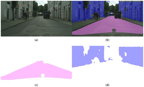 Semantic segmentation step in our method’s pipeline. (a) Original image. (b) Segmented image. (c) Road mask. (d) Fence mask.