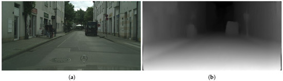 Next, we computed the disparity map of the input image by using a monodepth model pre-trained on Cityscapes by Godard [25]. Figure 7 shows the exemplary results of such a model when applied to a Cityscapes image.