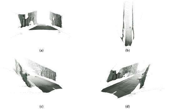 3D point clouds featuring points belonging to classes road and fence. (a) Front view. (b) Top view. (c) Left view. (d) Right view.