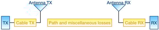 In Equation (3), and are the same of Equation (1), and respectively are the gains of the transmitting and receiving antennas expressed in dBi, while and are the losses due to cables and connectors severally at transmitter and receiver sides. is the path loss and it is normally named as free space loss. Finally, represents miscellaneous losses due to manifold potential causes (e.g., antennas polarization mismatch, obstructions within the first Fresnel zone and so forth). Both the latter two losses are expressed in dB.