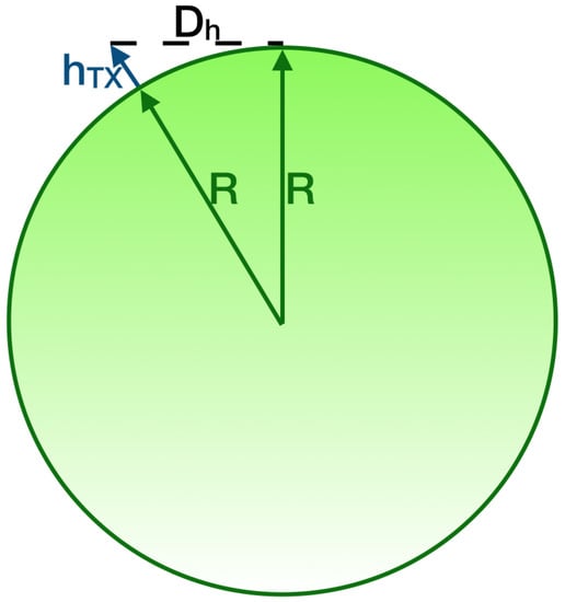 The direct LoS assessment considering the distance of the horizon from the transmitting antenna may be simply performed by making use of the Pythagorean theorem. Let approximate the Earth as a perfect sphere, having radius km, with no terrain irregularities: such hypothesis is a suitable approximation when links take place over the sea. Moreover, suppose that the transmitting antenna is mounted at an altitude above sea level (see Figure 3 bearing in mind that it is not in scale since its purpose is merely qualitative). Then, the distance from the horizon expressed in m, provided that either R and are so, is