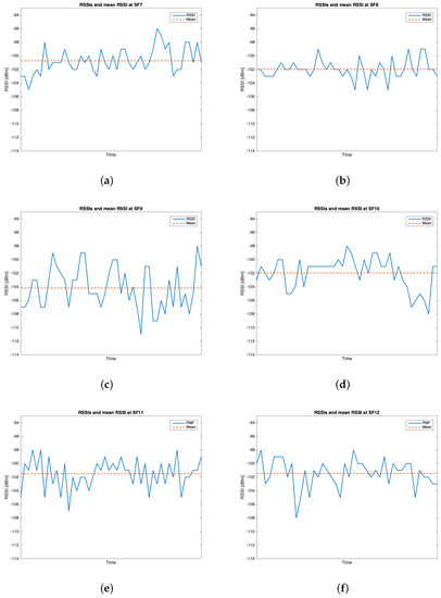 Hereinafter, the RSSIs and the SNRs will be analyzed, for each SF and for each test trial, by modeling them as discrete random variables. Indeed, the Gateways sample those quantities in a discrete fashion. In particular, the RSSIs take values in the set