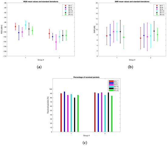 Group comparison graphical analysis divided by SFs: (a) RSSIs mean values and standard deviations; (b) SNRs mean values and standard deviations; (c) percentage of received packets.