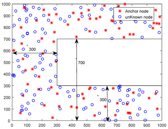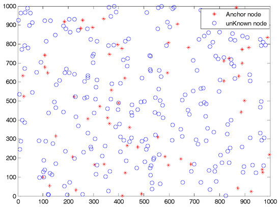 It can be seen that is the error between the actual distance and the estimated distance. Therefore, the goal of the optimization model (i.e., Equation (1) is to minimize the total error from the unknown node to all anchors.
