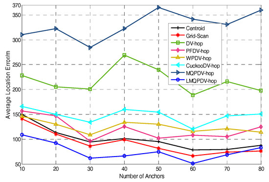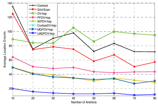 Among all these schemes, the location error of LMQPDV-hop was the smallest, and the fluctuation amplitude of its curve was also the smallest, which indicates that LMQPDV-hop had the best results and robustness.