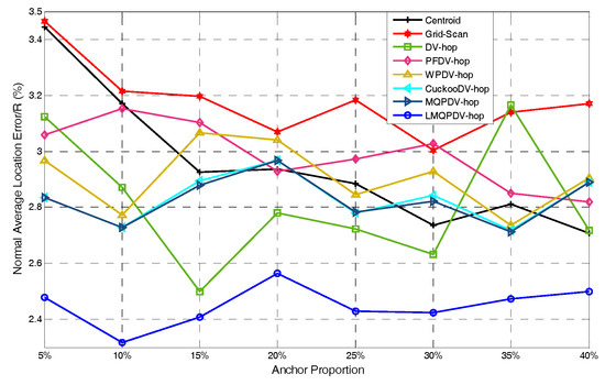 Now we analyze the first case. As shown in Figure 14, LMQPDV-hop had better localization accuracy than other DV-Hop-based methods (including DV-Hop), whereas compared to the non-DV-Hop-based ones (i.e., Centroid and Grid-Scan), LMQPDV-hop achieved the highest accuracy in half of these eight scenarios (i.e., 5%, 15%, 20%, and 30%). At the same time, we also made a horizontal comparison with WSN #1 in the same WSN scenario (i.e., Figure 13). The localization accuracy of LMQPDV-hop was significantly higher than that of the Centroid and Grid-Scan, which also means that the C-shape non-deployment area will greatly affect the optimization result of LMQPSO. Figure 14 illustrates that LMQPDV-hop still outperformed others in most cases.
