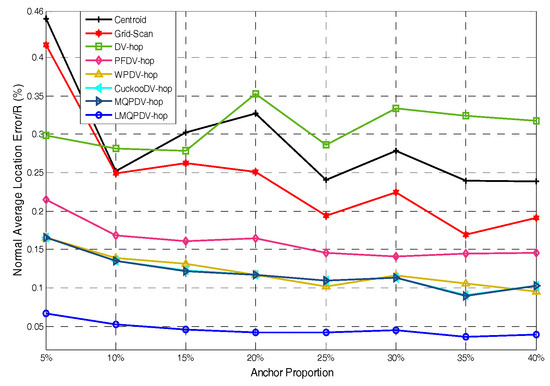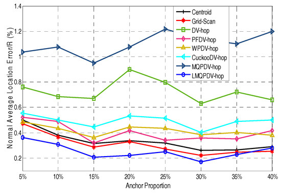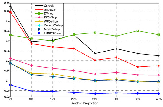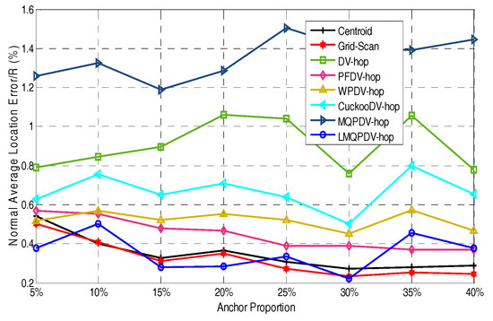 Figure 19 and Figure 20 show the influence of the number of anchors. Unlike Figure 17 and Figure 18, here, the anchors of WSN#1 and WSN#2 were chosen as follows: First, all the nodes were only randomly deployed once in WSN#1 and WSN#2. After deployment, each node is static and own its actual coordinate. Then, a certain number of nodes were randomly selected as anchors, and the rests acted as unknown nodes. In this way, the WSN topology of the first deployment remained the same throughout the selection process. All the anchor proportions in Figure 19 and Figure 20 were chosen randomly from the same WSN topology. Therefore, the location results for these different anchor proportions can be compared. As Figure 19 and Figure 20 show, the location errors in both WSN#1 and WSN#2 were decline as the anchor proportion increased, especially when the anchor proportion increased from 5% to 25%, the location error decreased sharply. This is because more anchors means a higher accuracy of the average hop distance and a fewer hop count, which can significantly reduce the error of the estimated distance from the unknown node to the anchors. Then, when these more accurate estimated distances were used to determinate the coordinates of the unknown nods, the location error could be reduced to improve the positioning accuracy.