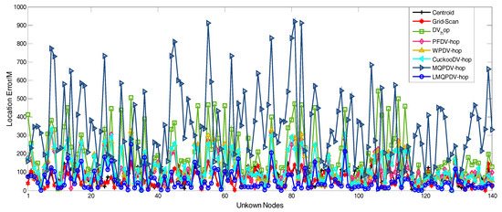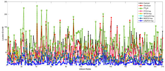 Figure 21 and Figure 22 describe the average location error of each unknown node in all the localization schemes. Here, the anchor proportion is 30% and R = 250. The abscissa represents each unknown node, and the ordinate represents the average location error. As shown in Figure 21 and Figure 22, it seems that the average location error of LMQPDV-hop was the smallest.