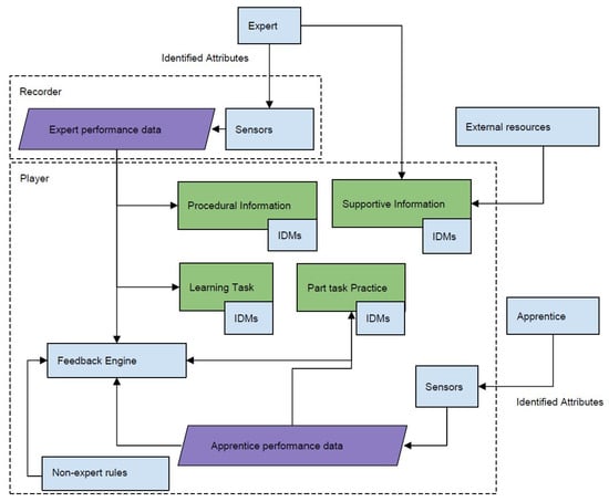 The ID4AR framework proposed by Limbu et al. [] supports instructional designers to design multi-modal systems with augmented reality and sensors for supporting deliberate practice. The framework exploits sensors’ capabilities to record performance data for training. It is designed to be domain-independent [] and is built in close collaboration with experts in three different domains. The framework’s motivation to capture expert model independent of domain-specific implementations was evaluated in Limbu et al. []. To do this, the “WEKIT” application, built using the ID4AR framework, was used. Before evaluating the framework itself, this application was evaluated in terms of having met the framework requirements, by the experts from the three domains, including experts who helped design the framework []. Then, the ID4AR framework was evaluated by capturing an expert model with the help of an expert who was familiar with the application. This model, which underwent no further post-processing, was then used by the other experts and rated to meet the training requirements. Results in Limbu et al. [] showed that the framework can be used across various domains. Below, we provide details on how “calligraphy trainer” was designed using the ID4AR framework.