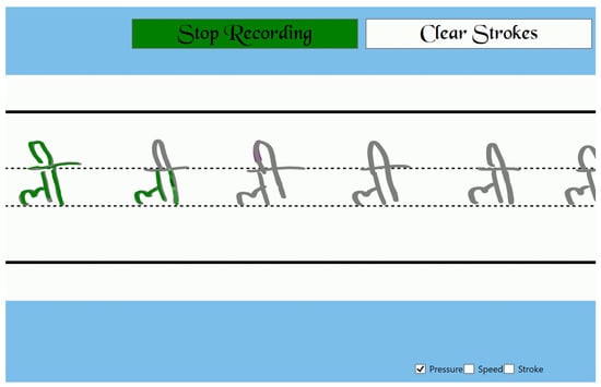 In addition to the feedback, guidance on the process to write the character was provided using the IDM “Augmented Paths” by displaying the character drawn by the expert as a semi-transparent image. Further supportive information on the character’s speed and the sequence was provided using an animation. The semi-transparent character was overlapped with a running animation which played according to how the expert drew the character. This guided learners on how the pen is moved, which is of more importance than the shape of the character itself [,]. The IDM summative feedback was provided by the expert with the help of the recorded data using the Visual Inspection tool [] (see Figure 5). The application records temporal data with all the sensors which can be loaded in the Visual Inspection tool along with a video recording of the performance.