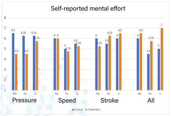 Self-reported questionnaires were used to collect the response on the mental effort required during each iteration. The mean response for both the control and treatment group according to the type of feedback is presented in Figure 6. We conducted the Shapiro-wilk test, which showed that control group iteration Ne_Pressure, Ne_all, Pa_pressure, Pa_stroke, and Pa_all were not normally distributed. While in the treatment group, iterations Ne_All and Pa_stroke were not normally distributed. A Manova was conducted to compare the mental effort between the control and the treatment group. There was no significant difference in the self-reported mental effort for all the iterations between the control and treatment group (see Figure 6).