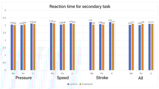 The secondary task logged the participant’s reaction time in milliseconds (see Mental effort in the Methods section). Any data point lower than 250 ms and more than 3750 ms was removed to account for accidental presses. Then, the reaction time was transformed into Log10. The mean reaction time for all the iterations between the control and treatment group is presented in Figure 7.