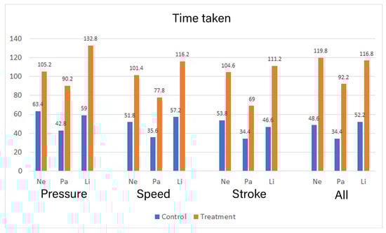 A Shapiro–Wilk test on the variables showed that all the data for time taken was normally distributed in both the groups. We conducted a Manova to compare the means between the two groups. There was a statistically significant difference between the two groups for mean time taken to complete the task for Pressure: F (3,6) = 6.378, p = 0.027, Speed: F (3,6) = 10.683, p = 0.008 and Stroke: F (3,6) = 7.628, p = 0.018. The effect for the group yielded an F ratio of F (1,8) = 15.971, p = 0.004 for character “Pa” and an F ratio of F (1,8) = 24.031, p = 0.001 for “Li” indicating significant difference between control and the treatment group for character Pa and Li while there was no significant difference between the groups in character “Ne” while providing pressure feedback. The effect for the group yielded an F ratio of F (1,8) = 22.800, p = 0.001 for character “Ne”, an F ratio of F (1,8) = 24.61, p = 0.001 for “Pa” and an F ratio of F (1,8) = 20.147, p = 0.002 for “Li” indicating a significant difference between control and the treatment group while providing speed feedback. The effect for the group while providing stroke based feedback yielded an F ratio of F (1,8) = 6.849, p = 0.031 for character “Ne”, an F ratio of F (1,8) = 14.025, p = 0.006 for “Pa” and an F ratio of F (1,8) = 25.920, p = 0.001 for “Li” indicating significant difference between control and the treatment group.
