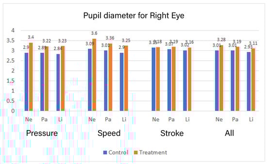 A Kolmogorov–Smirnov test indicates that the pupil dilation for the right eye in all intervention does not follow a normal distribution. A Manova test showed that based on the group, there was statistically significant difference in Pupil diameters for Stroke: F (6,26482) = 450.713, p = 0.000, Speed: F (6,24907) = 1593.861, p = 0.000 and Pressure: F (6,22071) = 2274.819, p = 0.000. There was also a statistically significant difference in pupil diameters for combined feedback based on the group, F (6, 22552) = 644.641, p = 0.000. The pupil diameter is provided only for the right eye in Figure 9, as one eye, is enough to estimate the mental effort.