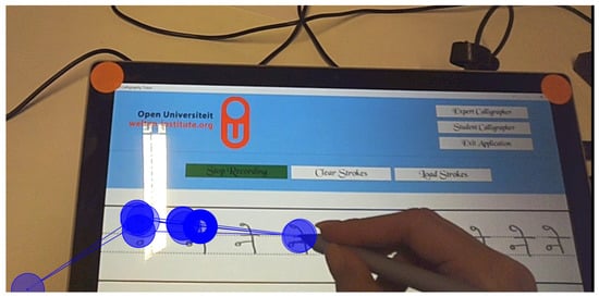 The application “calligraphy trainer” for handwriting practice was built to support deliberate practice in novice calligraphy learners. It was built using the “Instructional design for Augmented Reality” (ID4AR) framework from Limbu et al. [], which uses multi-modal data from experts to provide guidance and feedback. The application is designed to complement and support the expert rather than replace him/her. It uses various sensors to record an expert’s performance, which can be used for practice. This allows experts to rapidly create learning content and spend less time on guiding and providing feedback.