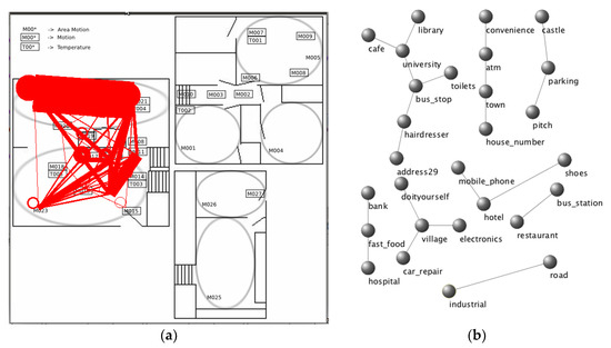 Example graph representations: (a) graph representation for activity ‘Breakfast’ in testbed ‘Cairo’; and, (b) selected edges that are triggered for a participant of age 22–27 in the Nokia smartphone dataset.
