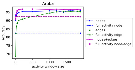 Accuracy of activity recognition for varying window sizes for testbed ‘Aruba’. ‘nodes’, ‘edges’ and ‘nodes+edges’ indicate the types of features extracted from the graph: node-based features only, edge-based features only, and both node and edge-based features, respectively. ‘full activity’ means the window size is set to the whole duration for an activity for building the graph.
