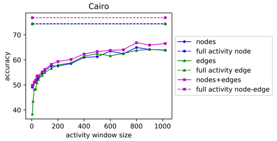 From these plots we observe that accuracy increases with increasing window size for all types of features for Tulum and Cairo. For Aruba, the highest accuracy is observed at window size 500, and accuracy decreases with larger window sizes until full activity. For Aruba and Tulum datasets, node features performed better than edge features, but the combination of nodes and edges performed the best for all of the window sizes. Edge features performed low for small window sizes near five seconds, but the performance increased faster with the increase in window size. This indicates that larger window sizes will contain more edge transitions that help to improve prediction performance. For the Cairo dataset, accuracy in general increases with window size for all types of features, but for node and edge features, accuracy sometimes decreases with increasing window size. For some window sizes, edges performed better, and for some window sizes, nodes performed better, as depicted in Figure 4. However, the combination of nodes and edges performed better than nodes and edges separately as features. Cairo accuracies using the combination of nodes and edges are increasing for all increasing window sizes, with one exception at window size of 900 s. We can conclude from the plots in Figure 3, Figure 4 and Figure 5 that either edge counts or the combination of node and edge counts always provides better performance than node and edge separately, regardless of window size.