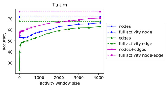 We vary the window sizes for each dataset from five seconds to the average window size for all activities (Aruba 1895 seconds, Cairo 1020 seconds, Tulum 4478 seconds). We apply linear support vector machine classification (LinearSVC from Scikit Learn [37]) with 10-fold cross validation and the one-vs-rest method for this multi-class classification task. Accuracy for activity recognition is shown for increasing the window sizes for dataset ‘Aruba’ in Figure 3, for dataset ‘Cairo’ in Figure 4, and for dataset ‘Tulum’ in Figure 5. In these figures, ‘full activity’ indicates the use of the entire activity for computation of graphical features instead of segmenting the activities into windows of specific time duration. ‘Full Activity’ is depicted using a horizontal line for each case of nodes, edges, and nodes+edges.