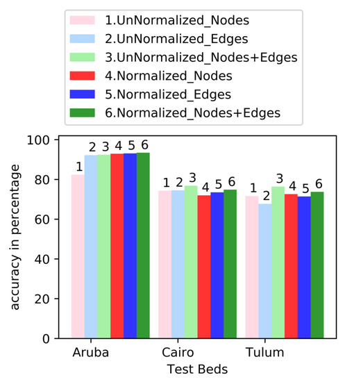 The number of nodes and edges triggered may vary with varying duration of different activities. Thus, we considered normalizing the graphical features (node counts, edge counts, and total number of nodes and edges) with respect to the total number of sensor events that occurred during each activity. Table 4 and Figure 6 show the impact of normalized graphical features on the accuracy of activity prediction. We used linear SVM from Scikit-Learn with default parameters, including one vs. rest as the method for multi-class classification. The combination of nodes and edges performed the best for all three testbeds. For Aruba, normalized features provide the best result; for Tulum and Cairo, unnormalized features provide the best result. Node normalization significantly improved the accuracy in Aruba and slightly in Tulum. Edge normalization improved accuracy in Aruba slightly and in Tulum significantly. Node and edge normalization both decreased performance in Cairo. Normalizing the combination of node-edge increased accuracy slightly in Aruba and decreased accuracy both in Tulum and Cairo. In all tables the best performers are in bold.