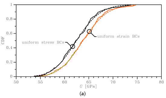 The mean value of the apparent Young’s modulus was slightly dependent on the BCs (as expected, see [32] and see Table 1): for the 2 × 2 m case, it amounted to E = 149.98 GPa for uniform strain BCs, while it read E = 148.11 GPa for uniform stress BCs. It was almost negligibly affected (on the order of 1%) by the dimension of the SVE (ℓ = 2 or 3 m) for the assumed grain size m. The results showed instead a larger influence of the SVE size on the standard deviation, as qualitatively shown in Figure 3 by the less steep CDF curve for the 2 × 2 m case with respect to the 3 × 3 m case. Quantitatively, the standard deviation for the uniform strain BCs increased from 3.34 GPa to 5.47 GPa when the SVE size decreased from m to m: the correspondent coefficients of variations (i.e. the ratio between the standard deviation and the mean value) were around 2.2% and 3.5%, respectively. We can interpret this larger scattering as the quantification of the effect of the grain morphology on the statistical distribution of E, as the grain size becomes comparable with the SVE size.