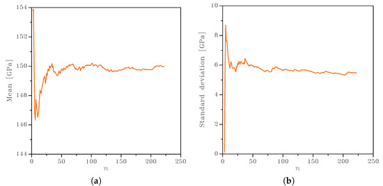 As in any MC analysis, results relevant to a sufficiently high number of samples have to be collected to guarantee the convergence in the statistics of the apparent properties. With the focus on the homogenized Young’s modulus of the polycrystalline film, some exemplary results are collected in Figure 7 for the 2 × 2 m SVE (top row), in terms of the convergence of the mean value and of the standard deviation with an increasing number n of samples. Besides some small fluctuations, visible only because of the reduced scale of the graphs, outcomes tended to converge and became stable even before n = 100. For the 3 × 3 m SVE shown in Figure 7 (bottom row), the convergence was attained even faster, as expected for a larger SVE. Such an evolution of the graphs was not directly related to some specific SVE morphologies, since they remained unchanged (within the limits of the statistical representation) by shuffling the order of the SVEs handled in the MC analysis. Similar results were observed for any elastic property of the film, and for any SVE size; the only slight difference at varying SVE size was the different value at convergence for the standard deviation.