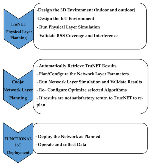 The proposed methodology creates a realistic snapshot of the Received Signal Strength (RSS) area coverage through TruNET which is then injected into Cooja, in order to generate a functional binary file that can be downloaded in real nodes for immediate implementation. In Figure 1, we present the flowchart of the proposed process for IoT sensor network deployment.