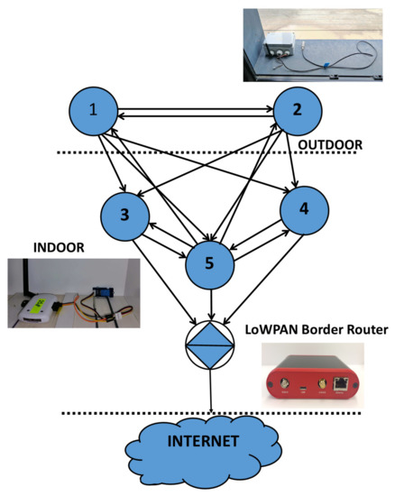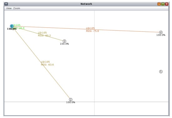 We deployed a real IoT network with Zolertia RE-Mote Revision B nodes. In the experimental setup, five nodes were placed in indoor and outdoor locations within and around a laboratory area of 100 m . The nodes were randomly relocated within the same area in order to increase the received sample size and ensure objective results [20]. In every topology setup, the nodes were connected in a LoWPAN Border Router and, from that point, to the Internet. A typical wireless topology utilized in the experiment is presented in Figure 3. RSS values were recorded for a period of one week, at 15-min intervals.