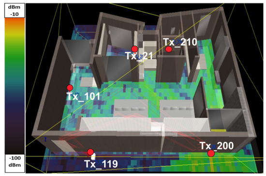 For every scenario, the RSS coverage map was recorded. A snapshot of the extracted radiomaps is depicted in Figure 4. The purpose of this step of the experiment is twofold: (a) to verify that the RSS values estimated by TruNET simulation are close to the actual measured RSS values and (b) to export the data in order to inject it into the Cooja simulator as per step III below.
