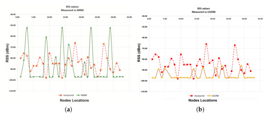 RSS: Measured vs. Cooja built-in Models Simulation (a) Measured vs. MRM Simulation; (b) Measured vs. UDMG Simulation.
