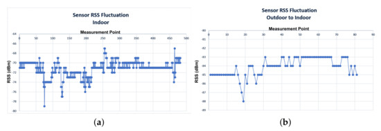 In order to further analyse the typical RSS fluctuation behaviour in a deployed WSN, the RSS values of wireless nodes for an indoor and outdoor scenario were monitored for a week. RSS measurements were recorded 24/7, in order to encapsulate any environmental factors, such as temperature changes, etc. The results, as shown in Figure 9, indicate that an RSS fluctuation, up to 12 dB may occur ( dB from the average RSS value). However, the overall performance of both indoor and outdoor sensors confirm a generally stable operation of –2 dB during of the recorded time. These findings are inline with other scientific work, such as [22,23]. In the aforementioned papers, authors reported an average standard deviation of RSS values ranging from 1 dB to dB depending on the device model. The RSS fluctuation range is also affected by human mobility within the study area [24]. These findings partially justify the errors occurring between the measured and simulated RSS values, as analysed previously. Other deviations can be explained due to the unavoidable introduced inaccuracies between the actual and simulated environment. Such inaccuracies may include material constitutive parameters values, object dimensions, geometry and 3D object placements.