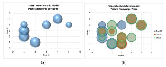 Analysis of results’ differences are much more easily spotted in Figure 10 and Figure 11. The most important observations are the following: (a) the packet exchange of Node 3 to Node 4, as well as Node 1 to Node 4, are only predicted by the combined usage of TruNET and Cooja simulators. These communication links are verified by the actual RSS measurements where we recorded RSS values between dBm to dBm, and they have been recorded. If this RSS value range is compared with results of Figure 2, it is obvious that network packets will be exchanged. (b) Node 3 and Node 2 are not expected to exchange any packets since they fail to establish a communication link (RSS values under the receiver threshold). However, MRM and UDMG models estimate a strong packet exchange. (c) Finally, the combined TrunNET-Cooja OSI cross layer expects that packet delivery between Node 3 and Node 5 will be problematic and packets will be lost, while the other two models expect an almost perfect packet delivery.