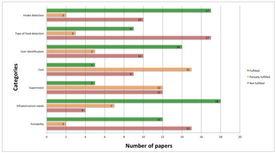 Taking into account the classification/issues detailed in the Section 2 (intake detection, type of food detection, user identification, cost, supervision, infrastructure needs, and portability) and the relevance of these papers for our initial hypothesis, already presented in the research questions subsection; out of the 219 papers, 29 papers were identified as of interest to be evaluated in the third phase.