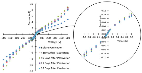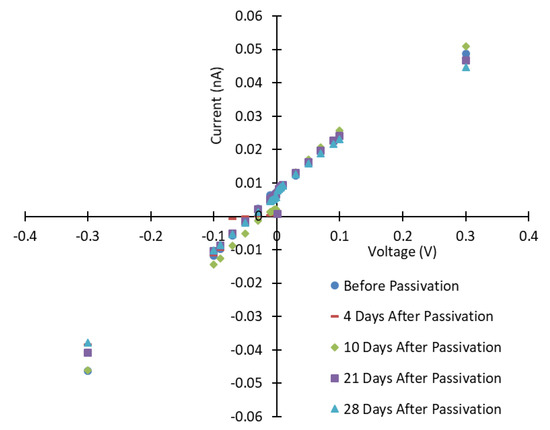 Current-voltage measurements were carried out in a specially customized aluminum box equipped with a Keithley Picoammeter, Voltage Source, model number 6487. The applied voltage range was −500 V to 500 V. The I-V data were collected for the sample before passivation in NH4F, and repeated 4, 10, 21, and 28 days after passivation.