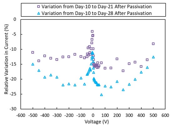 Relative variations in currents for days 10–21 and days 10–28 after passivation. These show a continuous decrease from day 10.