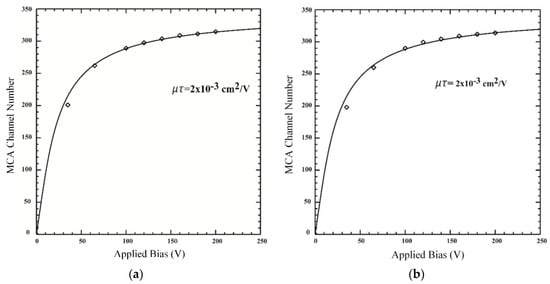 The electrons and holes generated in the CZTS wafer by incoming radiations are driven toward the respective anode or cathode by the internal electric field created by the applied voltage. The more the number of charge carriers collected at the electrode and the higher the charge-transport uniformity, the better the detector performance. The charge transport is measured in this experiment as an electron mobility-lifetime (µτ) product. Figure 5 shows the plot of the MCA channel number at various applied voltages for the sample before and after passivation. The electron µτ-product is 2 × 10−3 cm2V−1 for both cases. This implies that the passivation does not significantly affect the charge transport properties of the detector matrix as measured by the µτ-product. The µτ-product is important in the detector’s efficiency. There are other factors that also affect the energy resolution of the CdTe-based semiconductor detectors. The main factors that determine the energy resolution are electronic noise and fluctuations in the charge carriers (electron-hole pairs) produced by incoming ionizing radiation and collected at the electrodes [26]. The passivation process could affect these factors due to changes in the surface stoichiometry. According to Wright et al. [27], the resistivity of the region near the surface could change the electric field in the detector matrix. Changes in the internal electric fields of chemically treated CdZnTe samples were also reported by Pekarek et al. [28].