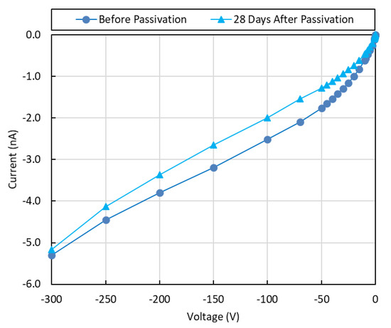 The negative sign on the negative currents represents the direction of electric current. Thus, we must use the absolute values of the currents when discussing their contributions to the electronic noise. Hence, a closer look at Figure 2 shows that 28 days after passivation in NH4F, the leakage currents (absolute values) for voltages between −300 V and 1 V were lower than pre-passivation values (see Figure 6 for applied voltages of 0 to −300 V). Thus, the applied electric field used for detector operation over this bias-voltage range is expected to contribute less electronic noise after passivation. This could explain the improved energy resolution for the detector at this applied negative bias range (see Figure 7 and Table 1).