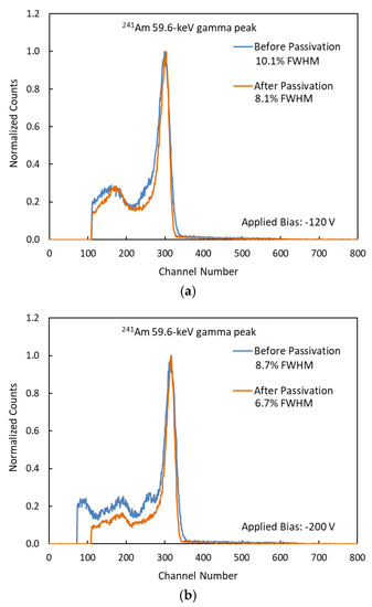 The responses of the detector, before and after passivation, to a sealed Am-241 nuclear radiation source, shown in Figure 7, indicate improvement in energy resolution. The improvement on the energy resolutions for the 59.6 keV gamma peak at various applied voltages are shown in Table 1. For each applied bias, there is no significant change in the 59.6 keV gamma peak position before and after passivation. The experiments showed an improvement in the energy resolution for each applied bias. The applied bias of −200 V gave the best energy resolution (8.7% FWHM) prior to passivation in NH4F. After passivation, the best energy resolution was observed at −180 V (6.4% FWHM). The average improvement in energy resolution was 25%. The maximum improvement was 33% at −35 V, and the minimum improvement was 19% at −100 V.
