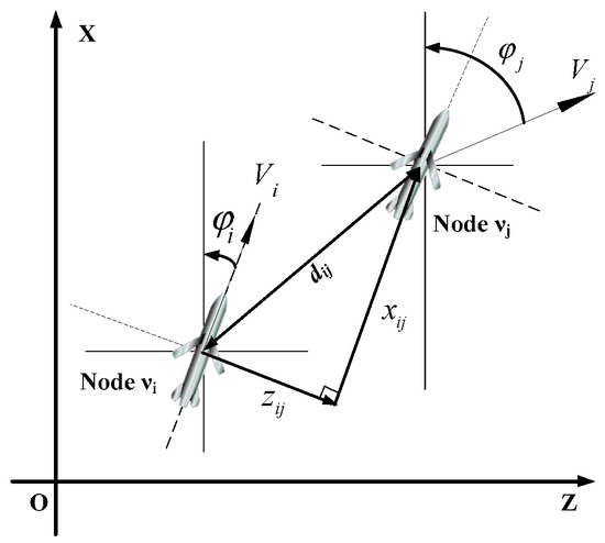 In Figure 1, and are the two nodes adjacent to each other. The flight path coordinate of node is set as the relative coordinate system, in which the x-axis represents the direction of the velocity and the z-axis is perpendicular to the x-axis shown as in Figure 1.