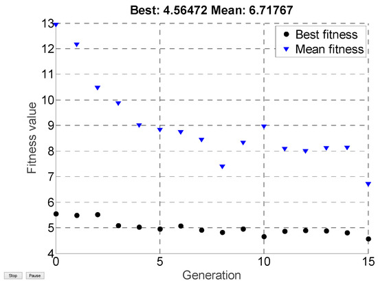 The optimization process of the designed parameters and is shown in Figure 4. After iterating 15 times with the genetic algorithm and running the Monte Carlo simulation 100 times per iteration, we got the optimal cost value: and the optimal parameters: