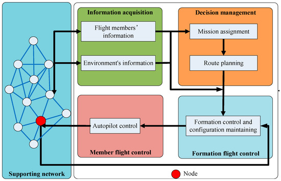 In the framework shown in Figure 5, the flight members in the formation are referred to nodes in the supporting network. The node obtains information through the formation support network and the sensor system, including neighbor nodes’ information and environment information. The decision management system allocates missions to flight members and plans the flight route for the formation. Finally, formation control system and member flight control system carry out missions using the stochastic system model (49) and the parameters presented above.